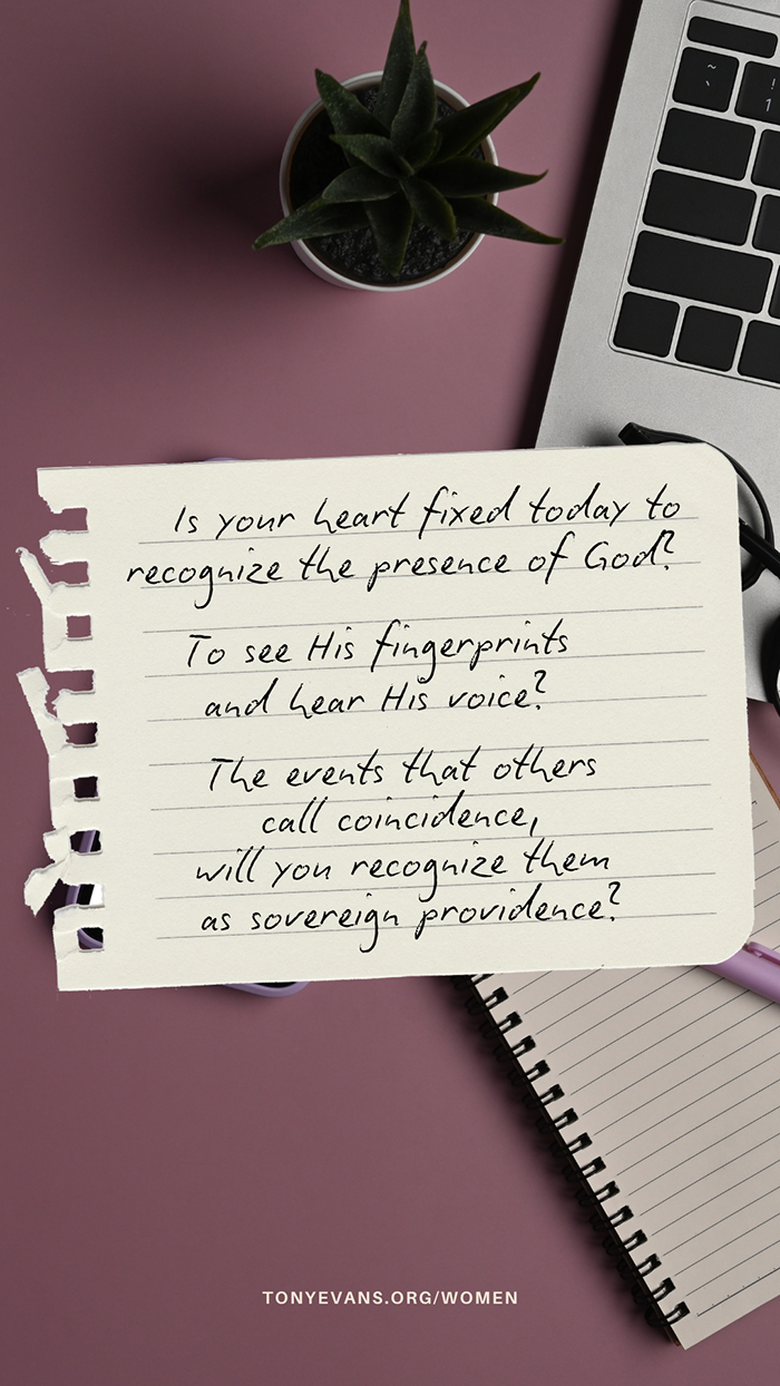 To see His fingerprints and hear His voice? The events that others call coincidence, will you recognize them as sovereign providence? Ask the Lord to sharpen your spiritual senses so that you catch a glimpse of His glory. Focus your expectation. Lean forward or on tiptoe. Resist the inclination to be so caught up in the temporal that you miss seeing the eternal. Scan the horizon for where His voice is calling out to you or where His fingerprints are working on your behalf.